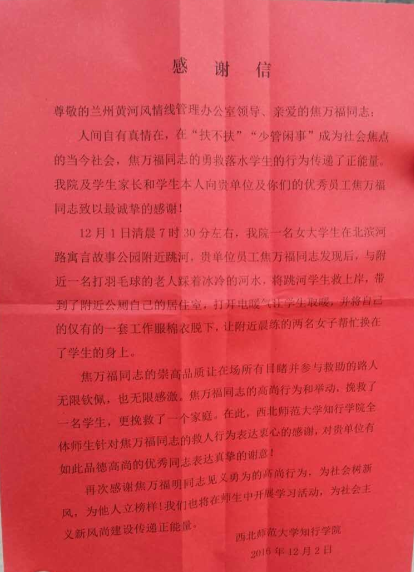 蘭州女大學(xué)生跳河輕生 城關(guān)物業(yè)保潔員冒險及時(shí)救人