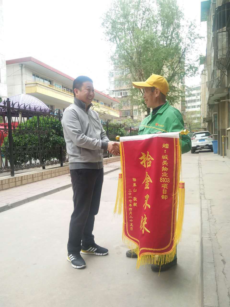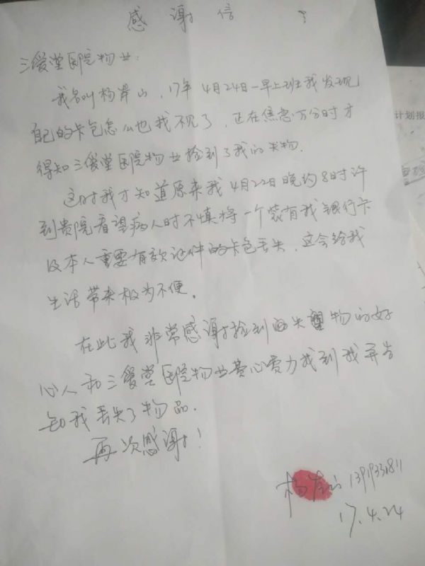 424一早,失主就來(lái)到了三愛(ài)堂醫院并將一副題為“拾金不昧”的錦旗送到了物業(yè)辦公室。失主激動(dòng)地握住賈經(jīng)理的手說(shuō)道:“感謝城關(guān)物業(yè)培養出了這樣一個(gè)品德高尚的員工,要不是這位員工,會(huì )給我的生活帶來(lái)多大的不便呀!”