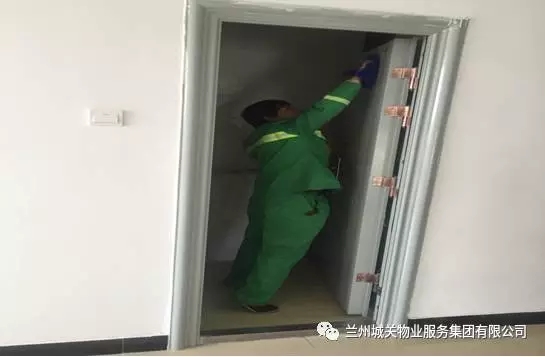正在擦拭宿舍樓內的樓梯間門(mén)上的灰塵