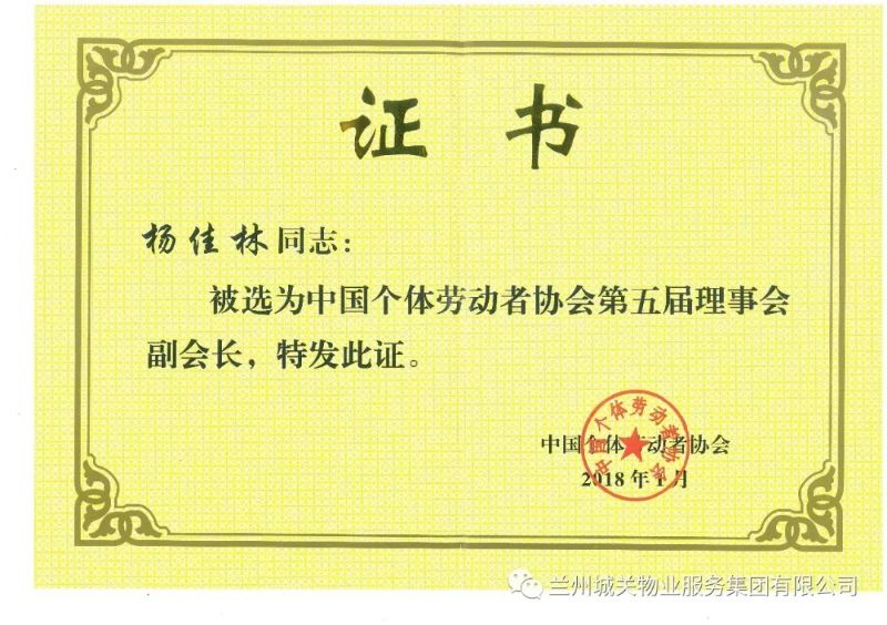 城關(guān)物業(yè)集團CEO楊佳林當選中國個(gè)體勞動(dòng)者協(xié)會(huì )第五屆理事會(huì )副會(huì )長(cháng)