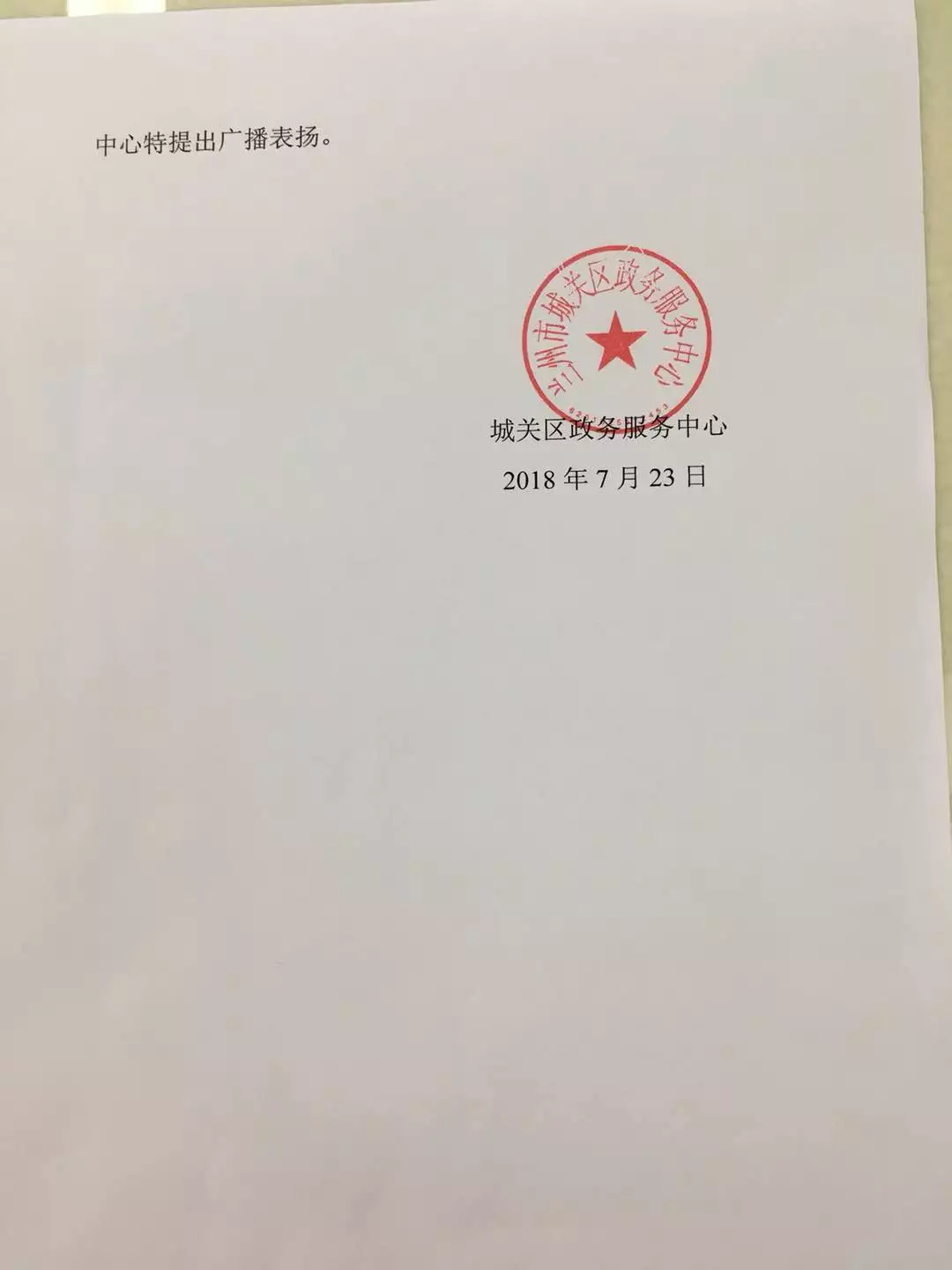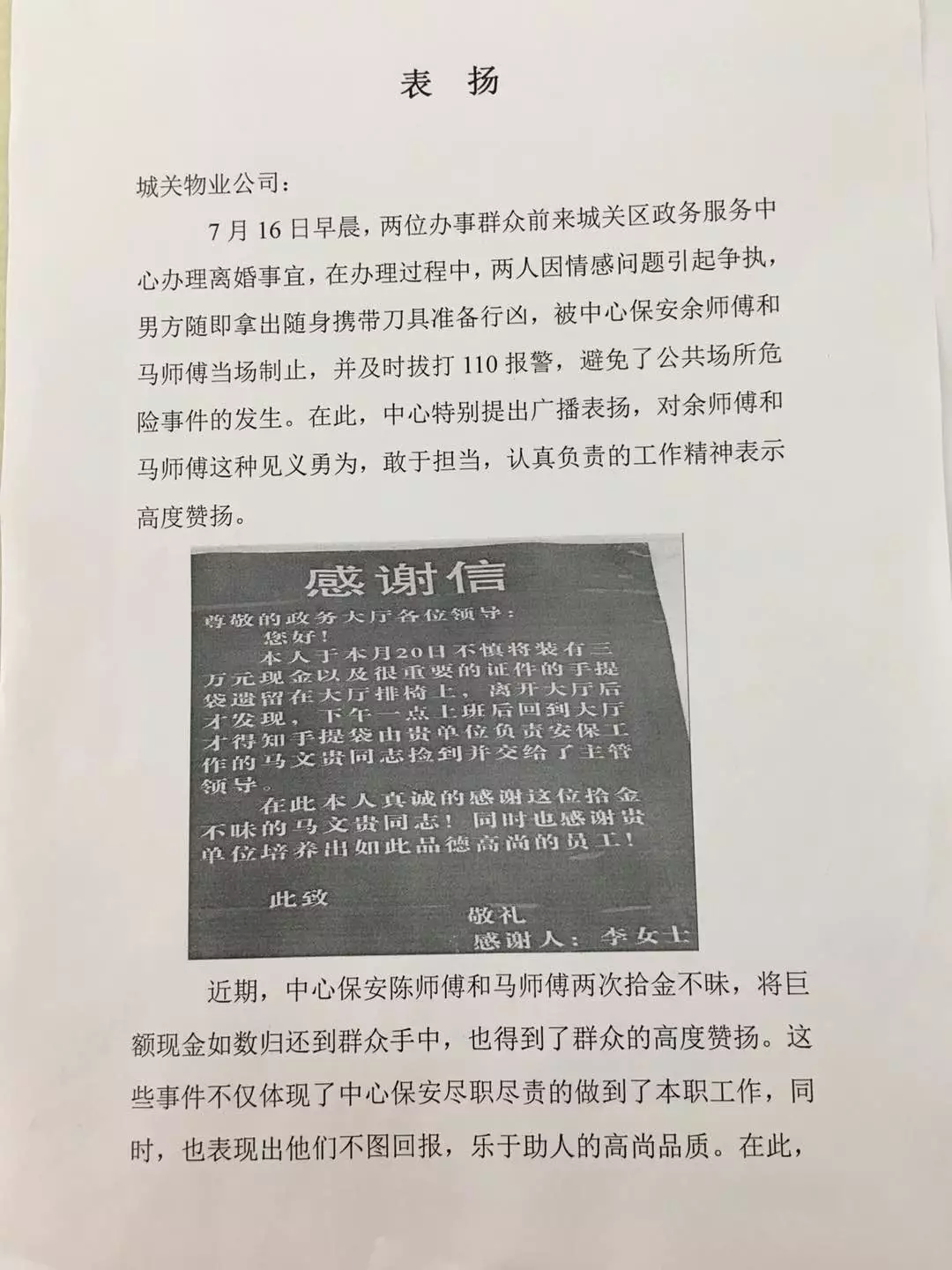 ▲城關(guān)區政務(wù)服務(wù)中心給城關(guān)物業(yè)馬文貴和余會(huì )明的感謝信