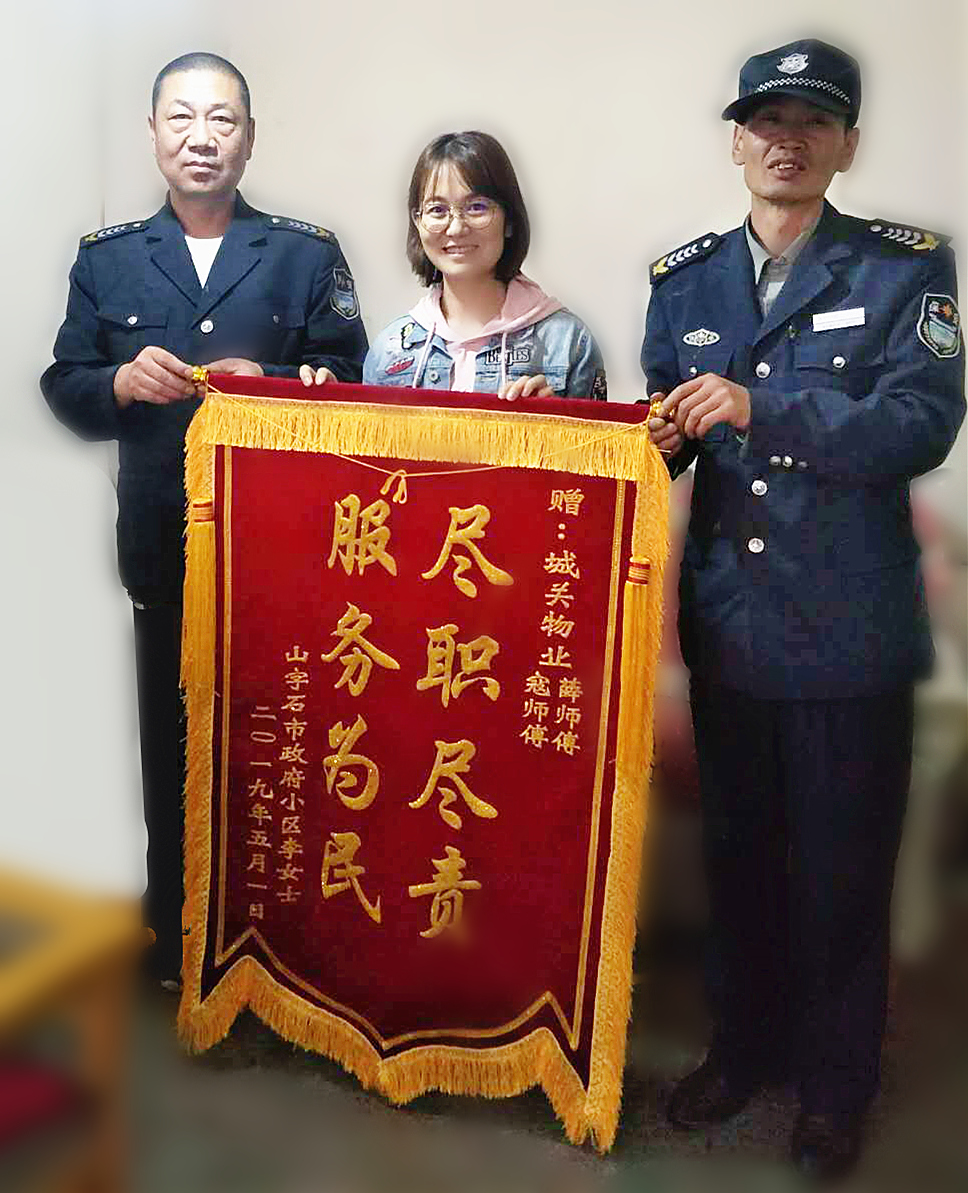 經(jīng)過(guò)半個(gè)月的排查,寇懷彥和薛叔杰最終確定領(lǐng)取人是旁邊小區的住戶(hù),經(jīng)過(guò)登門(mén)協(xié)調溝通,快遞于5月1日找回并完璧歸還,交由李女士手中。當李女士接過(guò)快遞,十分激動(dòng),“本以為我的快遞找不回來(lái)了,多虧你們的幫助,太謝謝你們了!”李女士為表感謝,特制作錦旗送至山字石家屬院的門(mén)崗處?軕褟┖脱κ褰芙舆^(guò)錦旗,喜笑顏開(kāi),他們表示:自己早就把山字石家屬院當成自己的家了,照看好家園、守護好家人是自己的職責,家人的東西丟了,我們幫忙去找,也是理所應當的事!