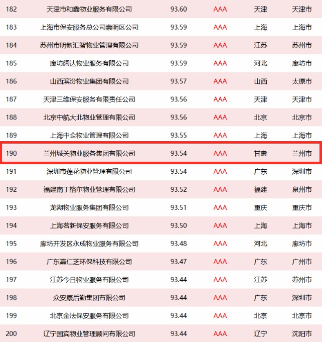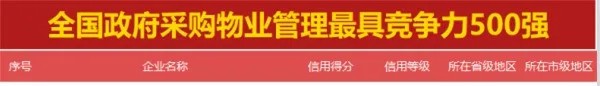 3月12日,政府采購大數據研究院和政府采購大數據網(wǎng)聯(lián)合發(fā)布了全國政府采購物業(yè)管理服務(wù)最具競爭力500強,城關(guān)物業(yè)憑著(zhù)過(guò)往良好的履約情況和風(fēng)險管控能力成功入選,以93.54分的信用得分榮獲第190名,成為甘肅省唯一入選前500強的企業(yè)。